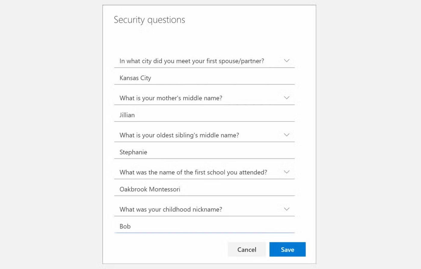 Todos hemos completado preguntas de seguridad en algún momento. Las preguntas de seguridad comunes solicitarán el apellido de soltera de su madre, el nombre de su mascota y dónde nació.